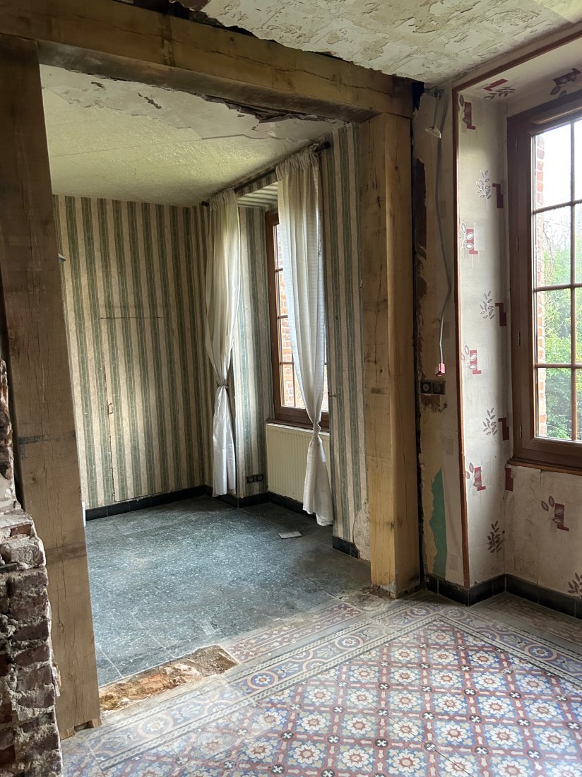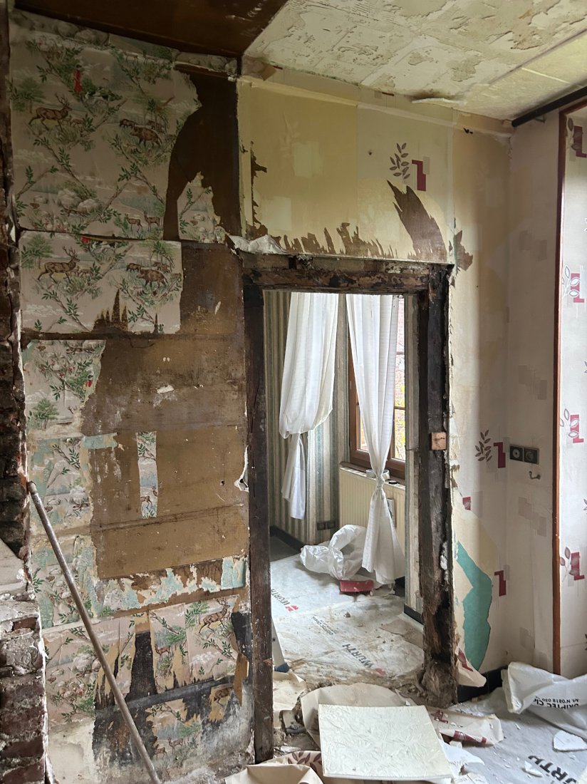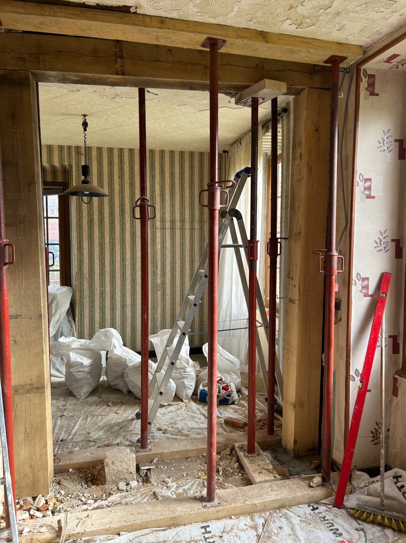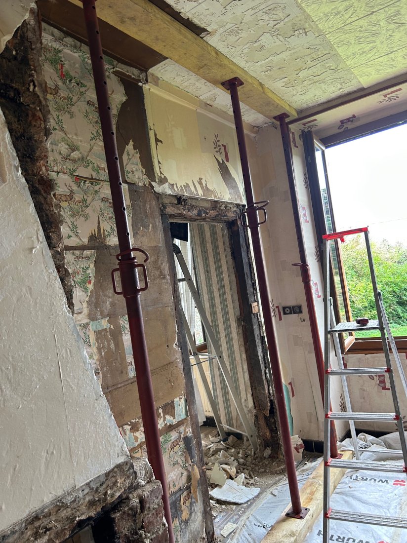 Photo d’un chantier de rénovation montrant la dépose d’un mur porteur, avec installation de solides poutres en chêne, illustrant le savoir-faire de Marius Filip en maçonnerie et consolidation de structures.