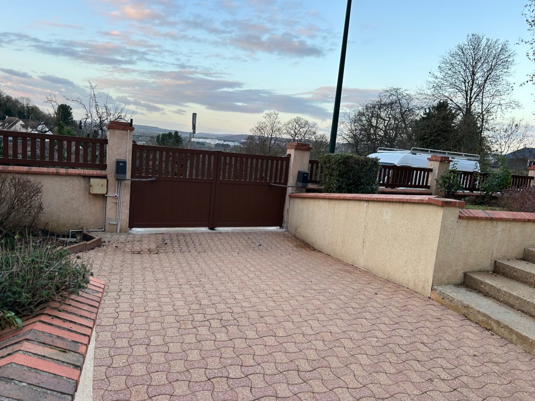 Un portail motorisé moderne, flanqué de piliers en maçonnerie élégante, s’ouvre sur une propriété sécurisée par une clôture soignée ; en arrière-plan, une façade fraîchement rénovée, mise en valeur par de belles portes.