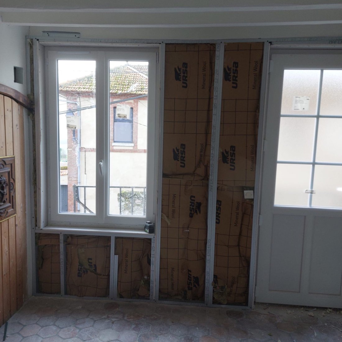 Nous avons soigneusement déposé les anciens éléments, préparé les supports et posé une laine de verre de 100 mm, reconnue pour ses qualités isolantes et son comportement au feu. Les nouvelles fenêtres et la porte, à double vitrage, offrent une isolation accrue et une meilleure sécurité. La pose de nouveau placo assure une finition parfaite et une intégration discrète de l’isolant. Le résultat : une baisse notable des factures de chauffage, un confort thermique et acoustique renforcé, ainsi qu’une valorisation de la maison sur le marché immobilier.