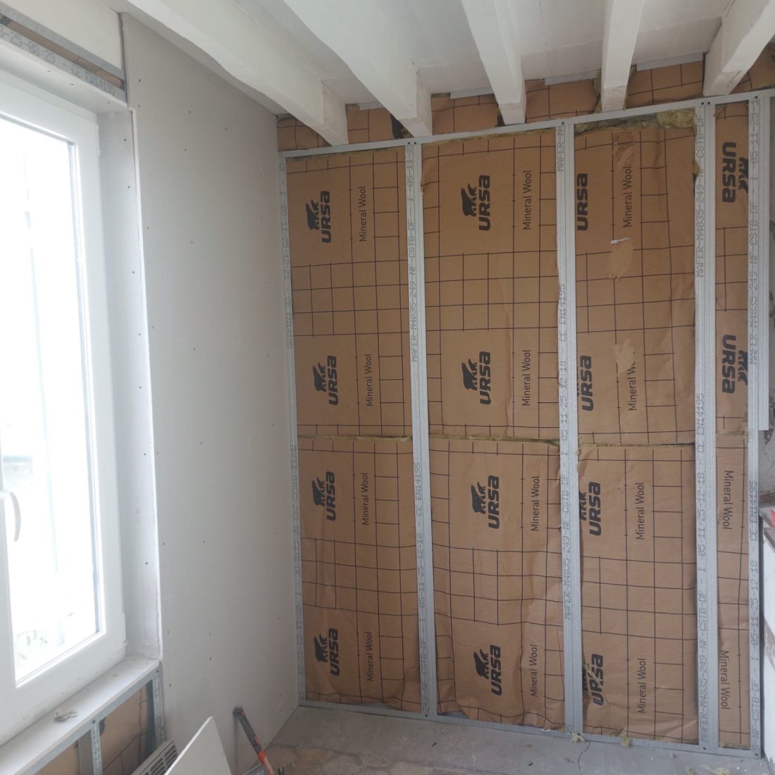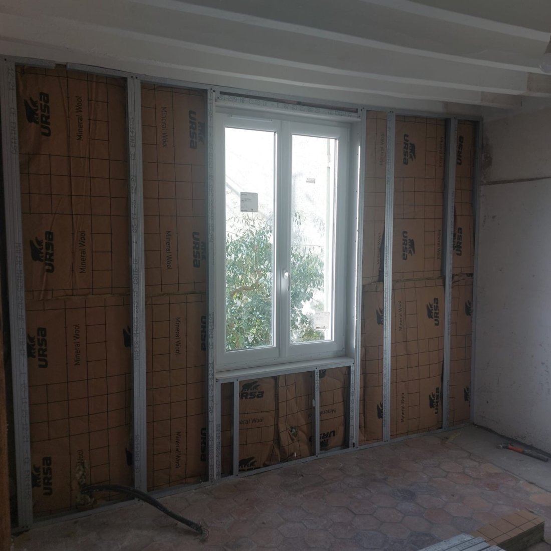 Photo d’un chantier de rénovation : ancien placo déposé, isolation renforcée avec laine de verre 100 mm, installation de nouvelles fenêtres et porte, et isolation des murs extérieurs avant la pose du nouveau placo par Marius Filip.