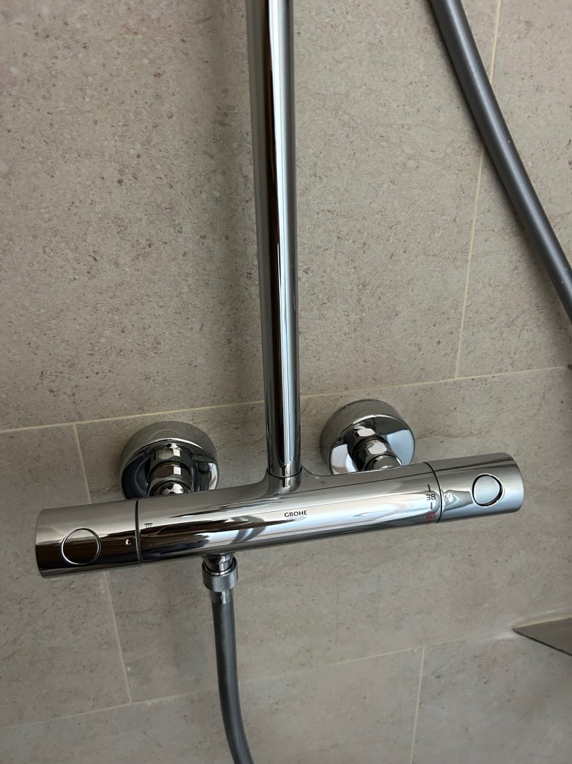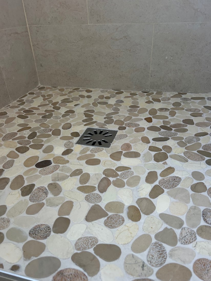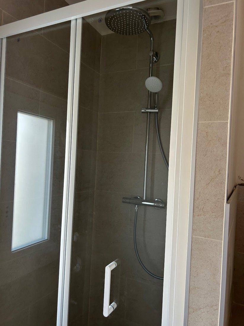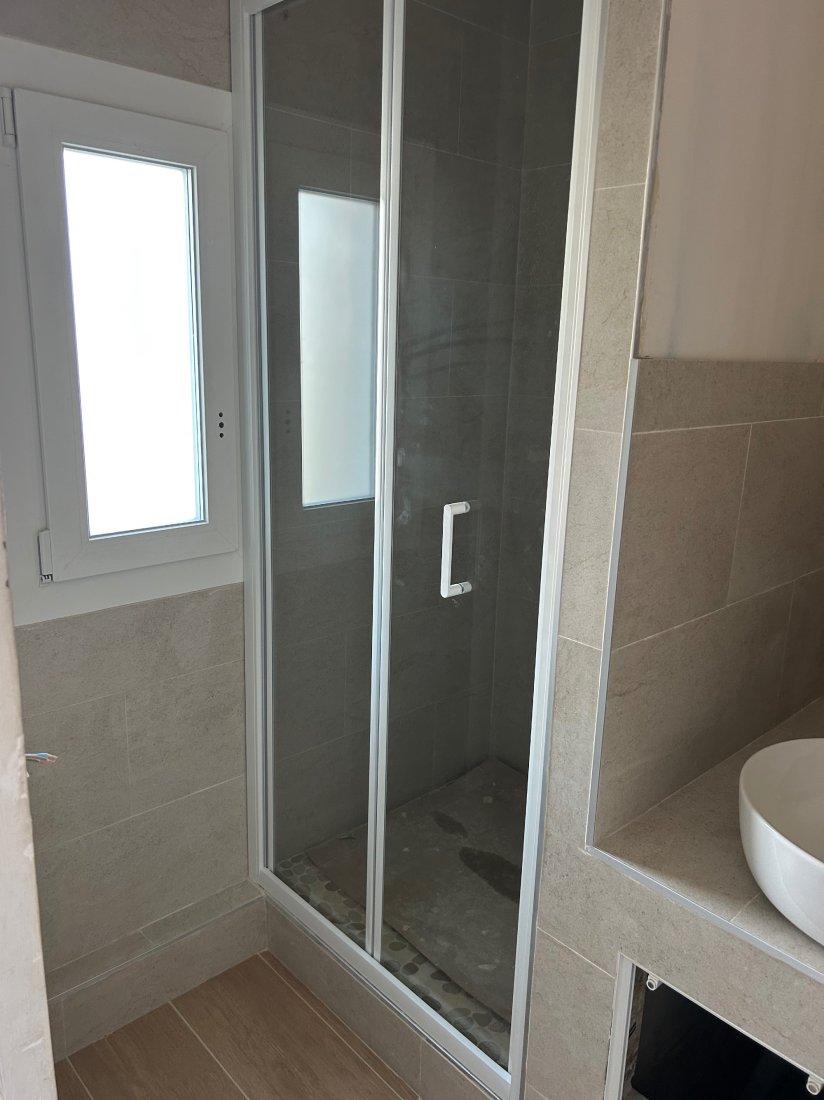 Salle de bain rénovée par Marius Filip : plomberie moderne, carrelage élégant au sol et aux murs, douche Wedi contemporaine, porte vitrée et finitions soignées pour un espace fonctionnel et raffiné.